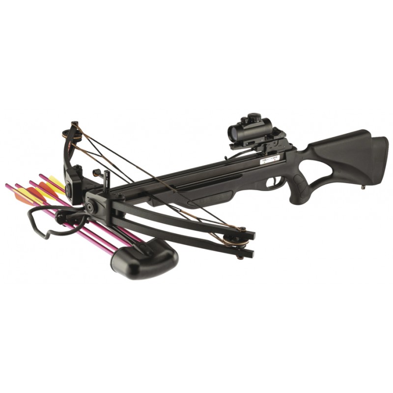 Arbalète avec cadre en fibre de verre et crosse composite, armement facilité par le système de poulies.