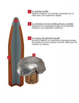 La simplicité étonnante de cette balle à pointe molle en plomb et à chemise spécialement crantée permet d'obtenir un très bon pouvoir d'arrêt du gibier.
