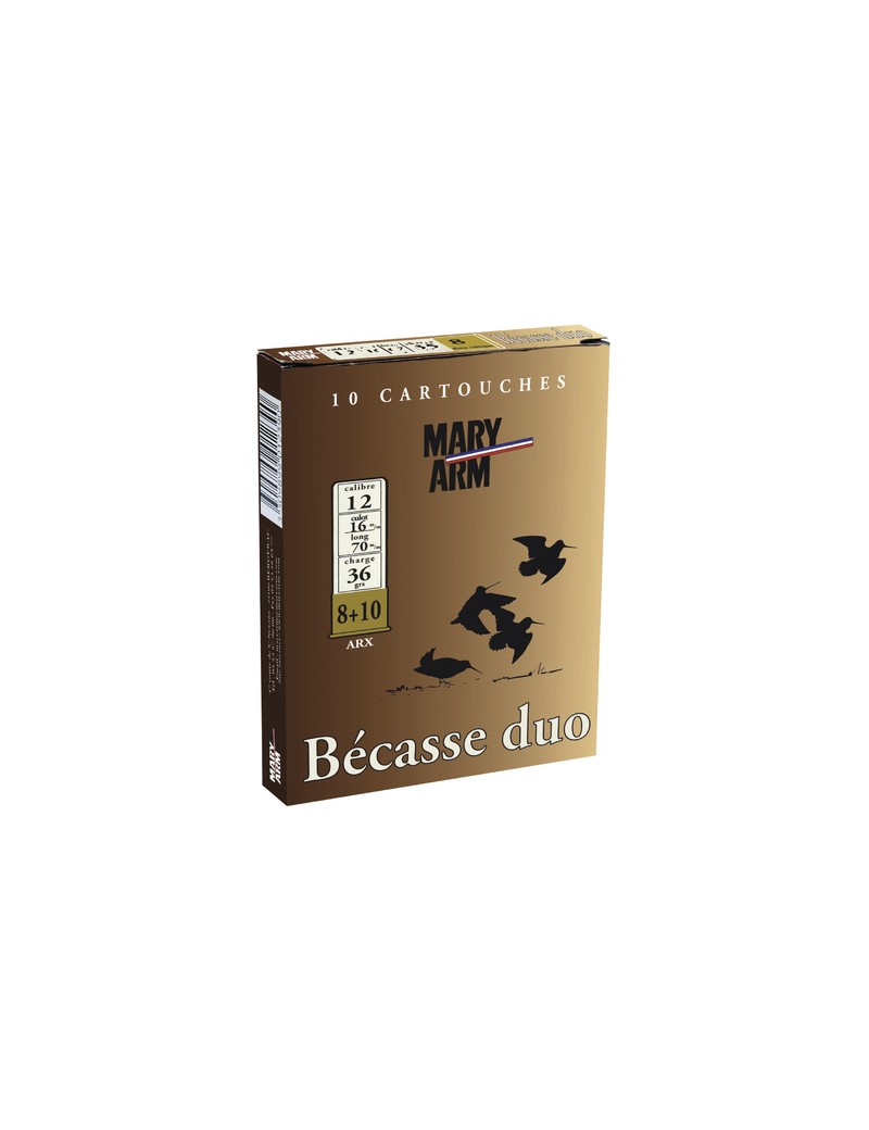 Une cartouche spéciale bécasse pour les 2 coups : l'association de deux numéros de plombs en 8 et 10 avec un disperseur ARX, procure à cette munition une amplitude et une régularité de gerbe remarquable.