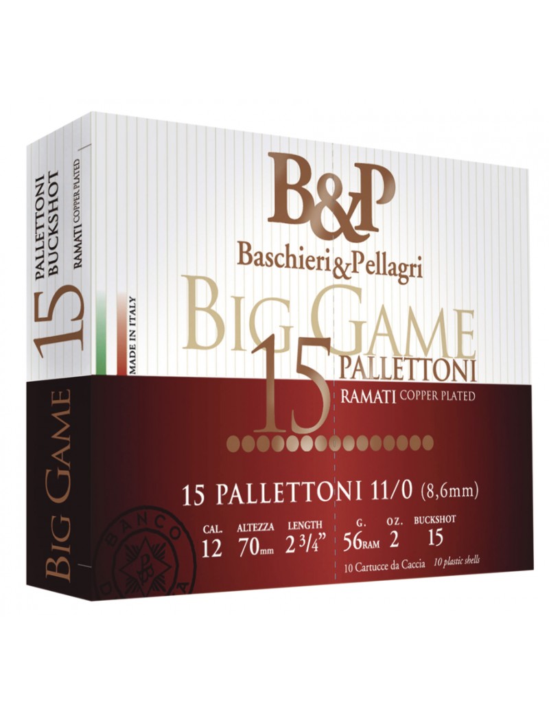 Les cartouches BIG GAME 15 PALLETTONI COPPER PLATED sont chargées de 15 chevrotines (15 grains - Ø 8,6 mm) en plomb avec traitement de cuivrage.