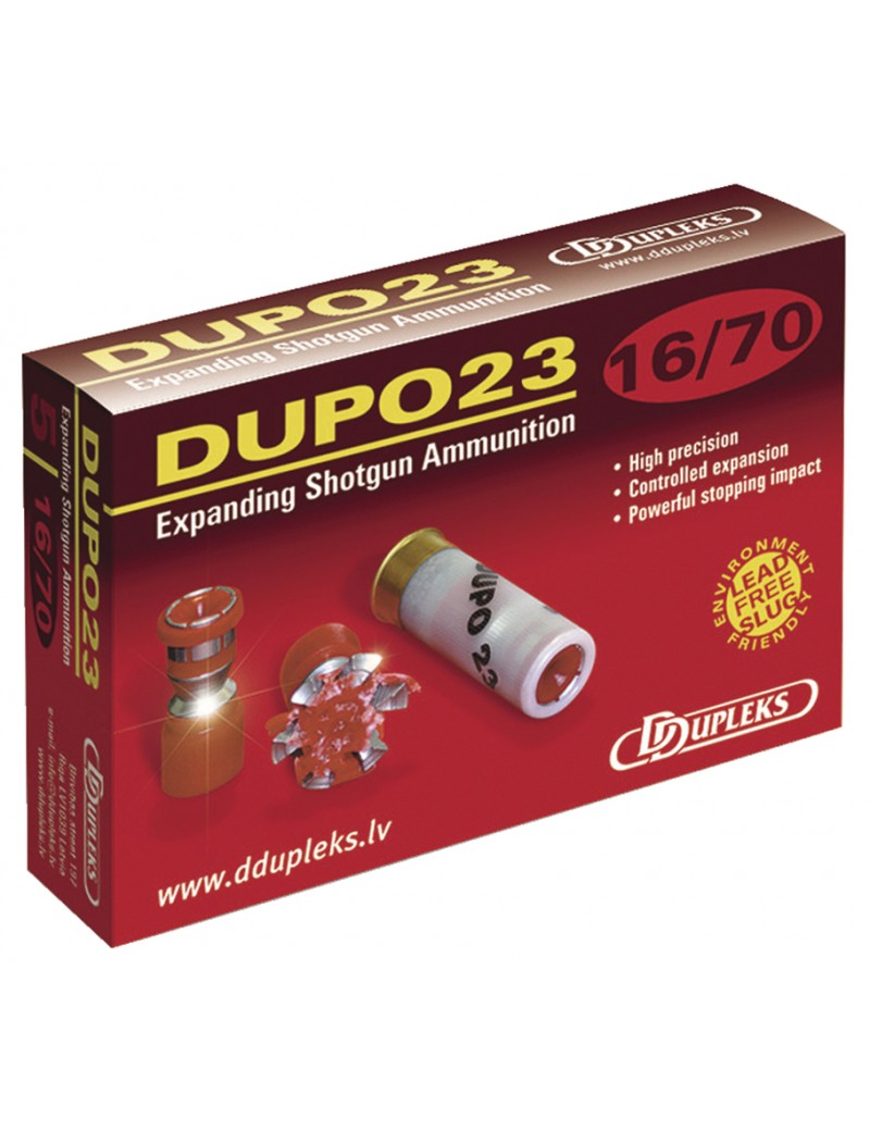 yle="color:#333333;font-family:Oswald, sans-serif;font-size:15px;letter-spacing:1px;background-color:#ffffff;">Type: BALLE - Marque: DDUPLEKS - Modèle: DUPO 23 - Calibre: 16 - Chambre: 70 mm - Poids grain (GR): 355 GR - Poids (g): 23 g - Bourre: À JUPE - Culot: 15 mm - V0: 440 m/s - Conditionnement: BOÎTE DE 5 - Catégorie : Catégorie C