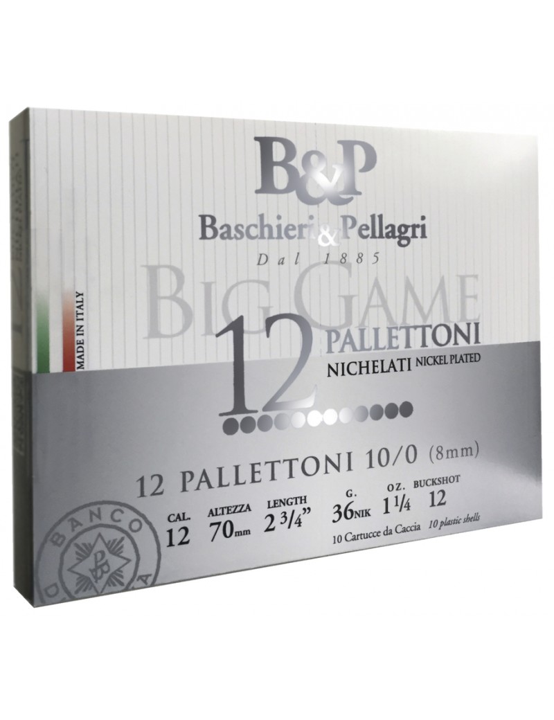 Les cartouches BIG GAME 12 PALLETTONI sont chargées de 12 chevrotines (12 grains - Ø 8 mm) en plomb Nickelé.