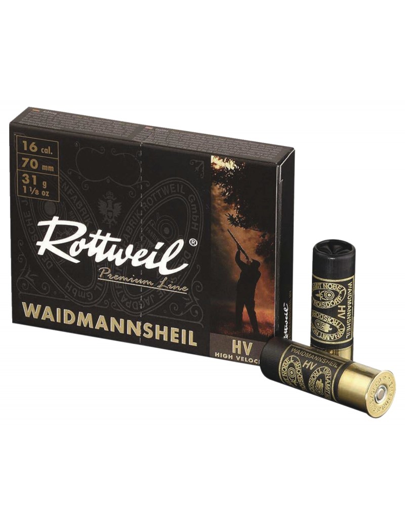 Type: CARTOUCHE - Marque: ROTTWEIL - Modèle: WAIDMANNSHEIL HV - Calibre: 16 - Chambre: 70 mm - N° plomb: 6 - Poids (g): 31 g - Bourre: À GODET - Conditionnement: BOÎTE DE 10 - Catégorie : Catégorie C