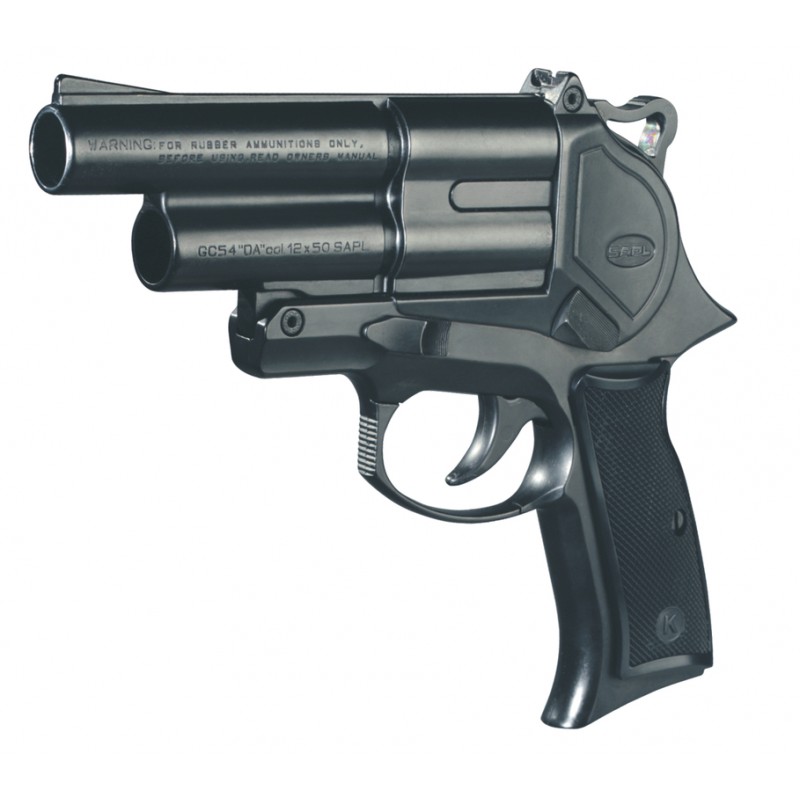 Pistolet Cal.12/50 SAPL®, double canon basculant (canon supérieur 149 mm, canon inférieur 119 mm). Système simple et double action. Dimensions : 230 x 180 mm. Poids 1200 g.